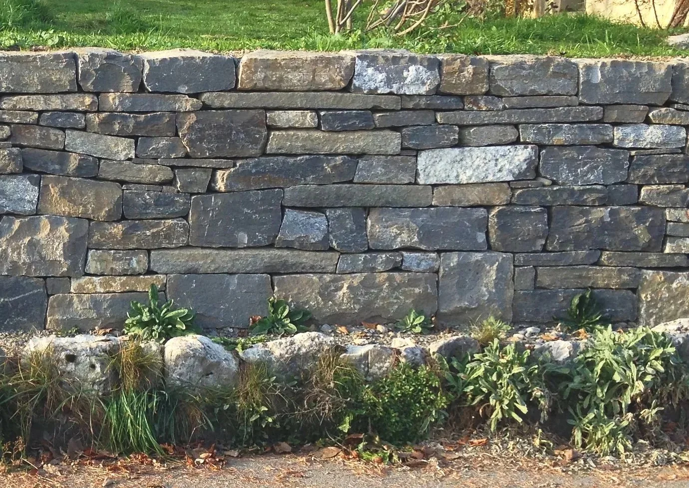 Oben links: Quarzsandstein (Flysch), durchmischt mit Gneisplatten, Gartenstützmauer, Privatgarten
